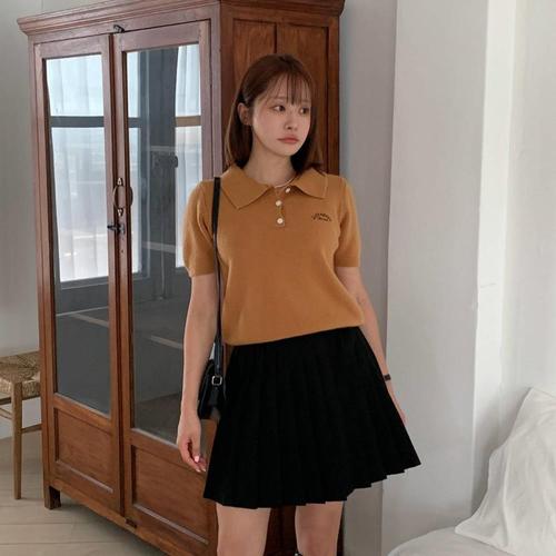 [옷자락]여성 캐주얼 레터링 자수 반팔 니트카라넥 단추