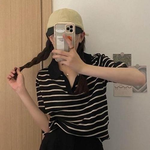 [엄지척]스트라이프 여성 카라 브이넥 반팔 여름 니트 티셔츠_19613799_667501