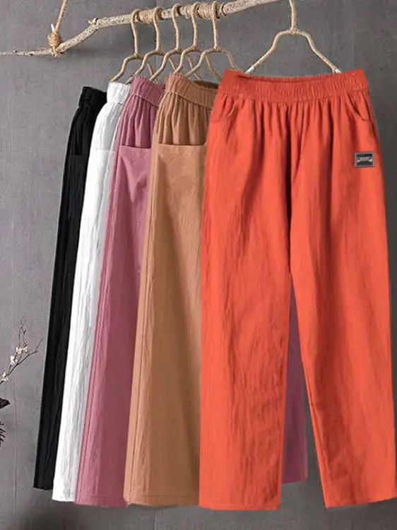 여름 캐주얼 코튼 린넨 루즈핏 여성 바지 밴딩 허리 하렘 팬츠 한국 스타일 하이웨이스트 9부 바지