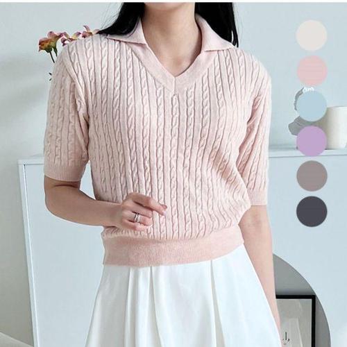 [갓샵]여성 쫀쫀 꽈배기 크롭 반팔 니트 티 V넥 [4color 브이넥 여자 골지 여름 얇은 상의 티셔츠]