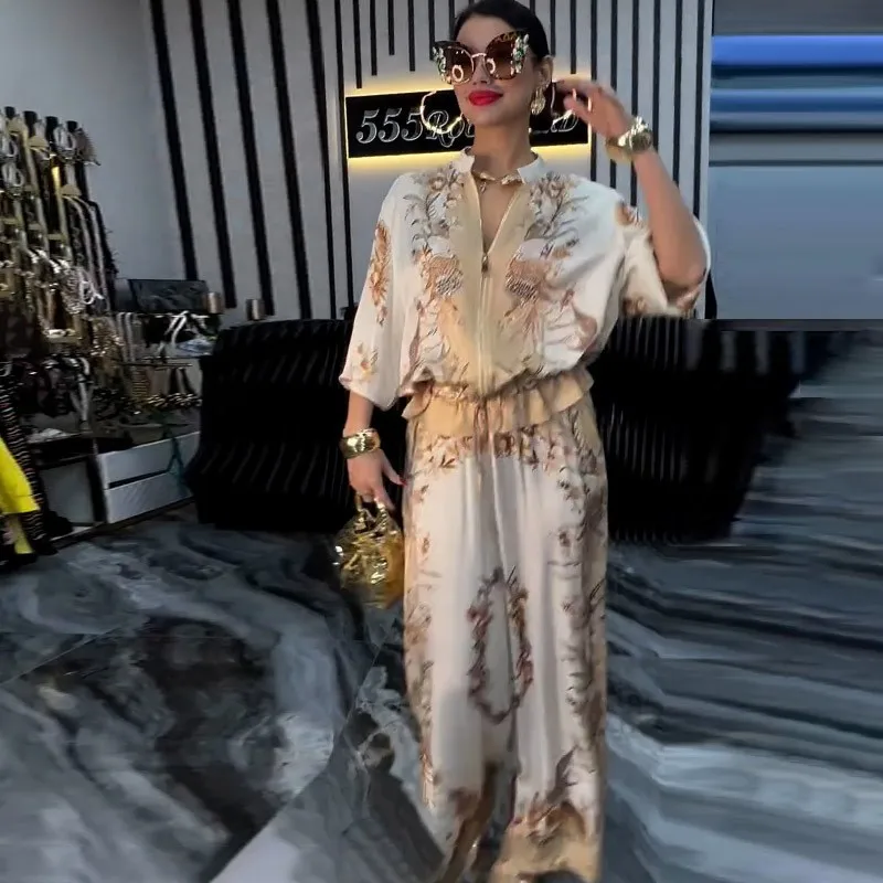여름 패션 인쇄 여성 2 피스 세트 꽃 지퍼 야구 유니폼 Drawstring 바지 투피스 복장 우아한 사무복