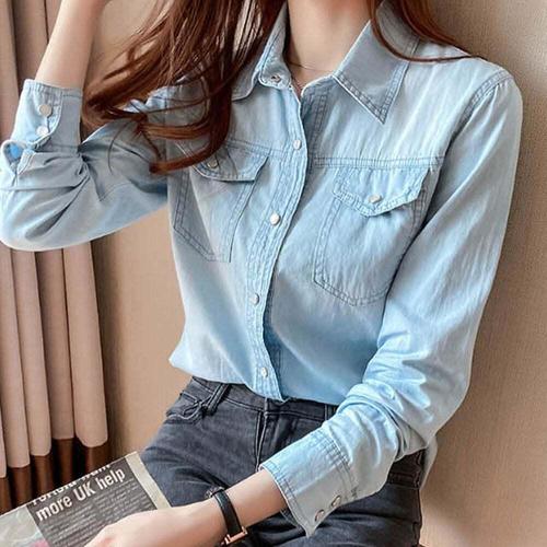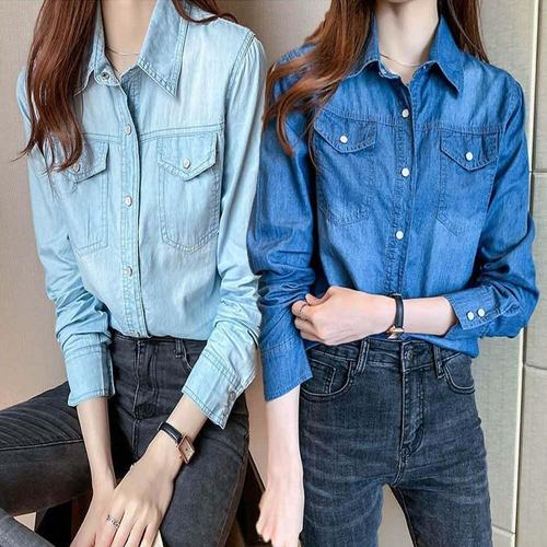 EAMT 여성용 청 빈티지 캐주얼 봄 상의 셔츠 무지데님 긴팔 아우터 EUNG1