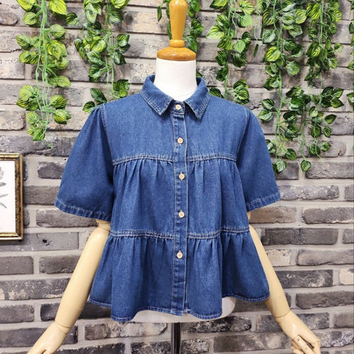 퐁당 / 귀욤 층층 라인 카라 청 셔츠 반팔 블라우스
