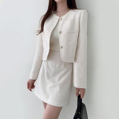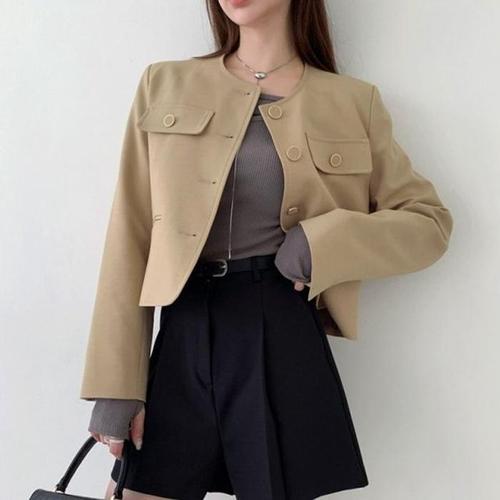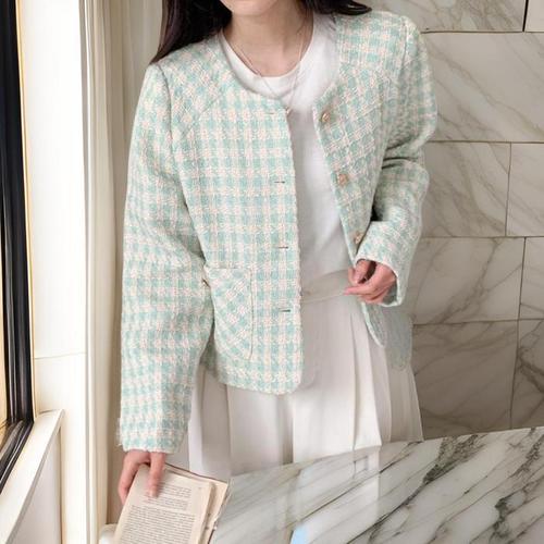 [에이치플러스몰]여성 깔끔한 톤맞춤 버튼 노카라 트위드 크롭 숏 자켓