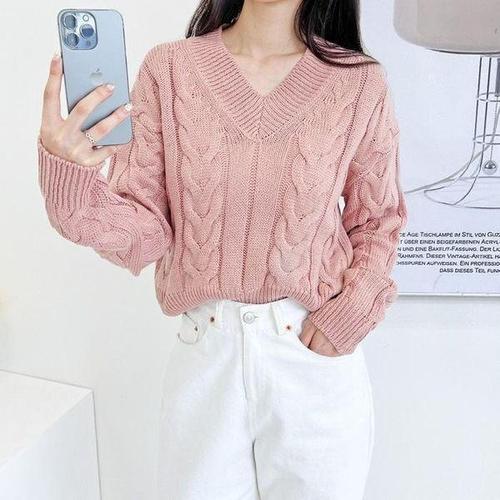 [셀러허브_여성트랜드패션]ONM 여성스런 루즈핏 핑크 브이넥 봄 긴팔 니트티