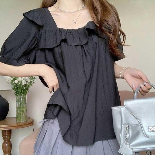 [신상오픈런]여성 프릴 퍼프 소매 버튼 카라넥 반팔 셔츠 블라우스