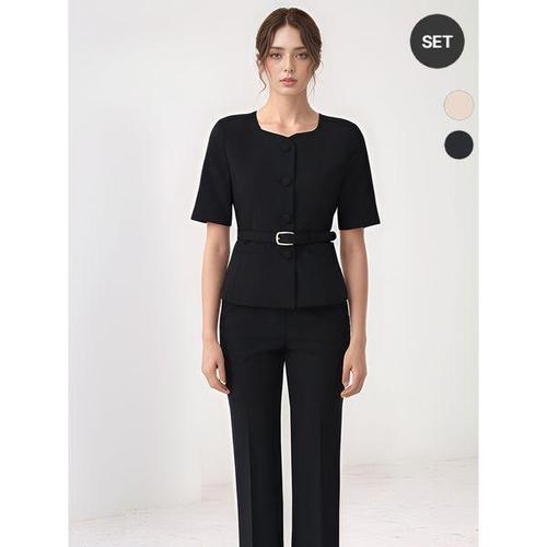 [비비드시크릿가너]SET 여성 스퀘어넥 여름 벨티드 정장 자켓+팬츠 세트