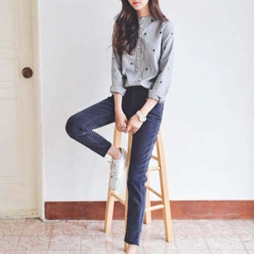 M2 여성 무지 셔츠 블라우스 캐주얼 데님 긴팔 빈티지 차이나 몰드 톱 JEN1