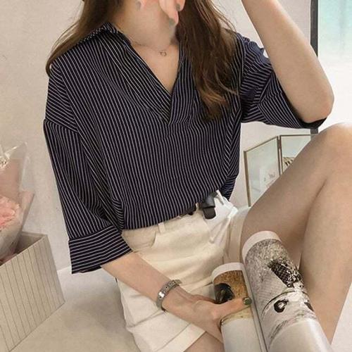 [셀럽하우스]여성셔츠 RBGC7985 LK 셔츠 스트라이프 5부 카라 반오픈 롱셔츠