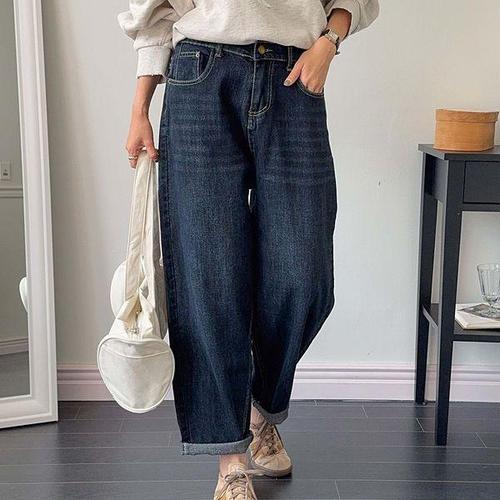 [옷자락] 여자 가을 배기진 캣워싱 논스판 코튼 와이드 청바지