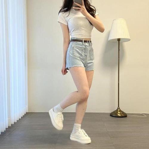 [에이치플러스몰]투버튼 여성용 블루진 하프팬츠 밴드캐주얼 청반바지
