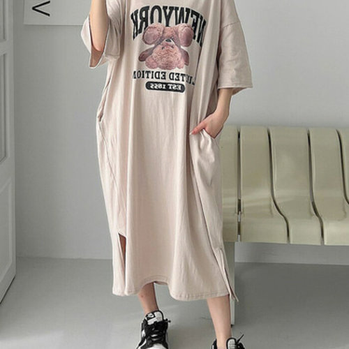 에르디테 / 곰돌이 레터링 프린트 옆트임 주머니 데일리 롱 원피