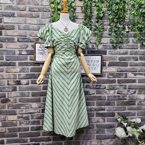 퐁당 / 옆트임 사선 스트라이프 퍼프소매 원피스