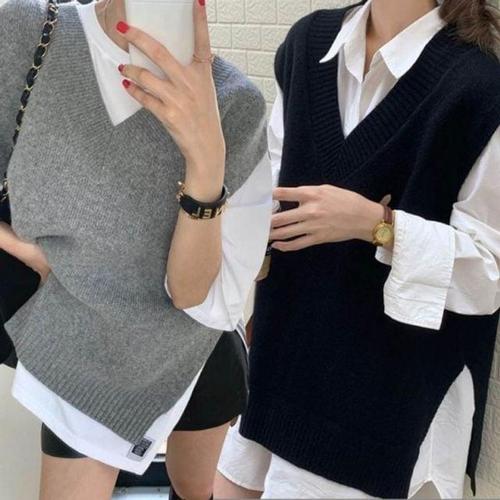 Kdragon 여성 옆트임 오버핏 단색 니트 베스트 기본 브이넥 컴포트 심플 조끼