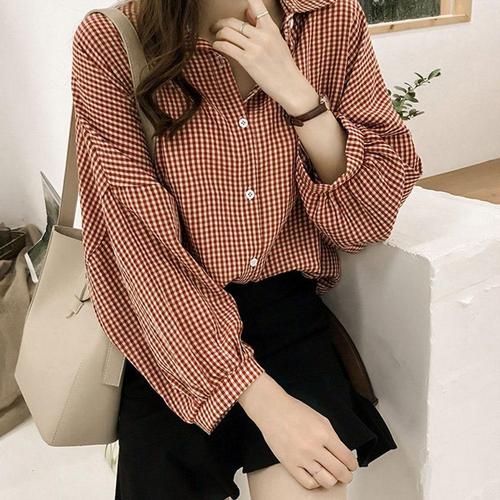 [모노무드]MNO 레이디스 셔츠 톱셔츠 벌룬소매봄나들이 배색컬러 체크무늬 예쁜 셔츠 데일리룩