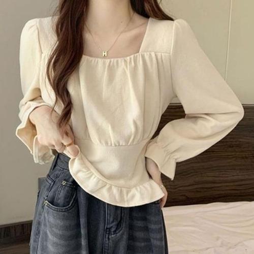 [하프클럽/]스퀘어넥 셔링 긴팔 예쁜 블라우스 체형커버 여리핏