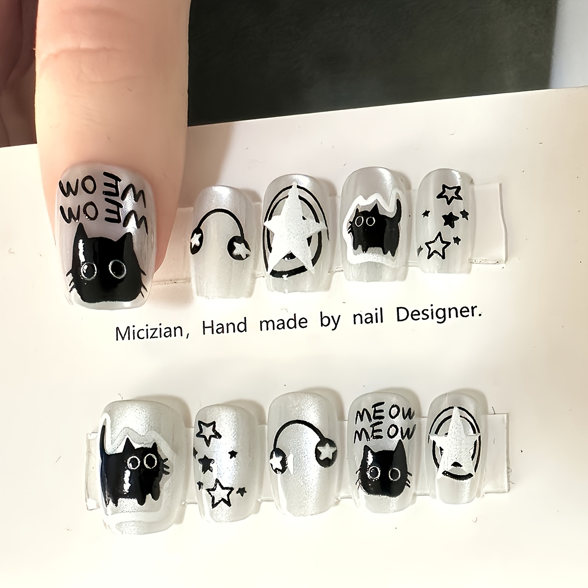 TEMU 10개 블랙-블루 그라데이션 별 장식 네일 팁 | 스위트하고 엣지 있는 숏 캣아이 매니큐어, 패션 풀 커버리지, 글로시 마감, 여성 데일리 출퇴근, 여행, 휴가, 파티 및 모임 필수 뷰티 아이템|네일팁
