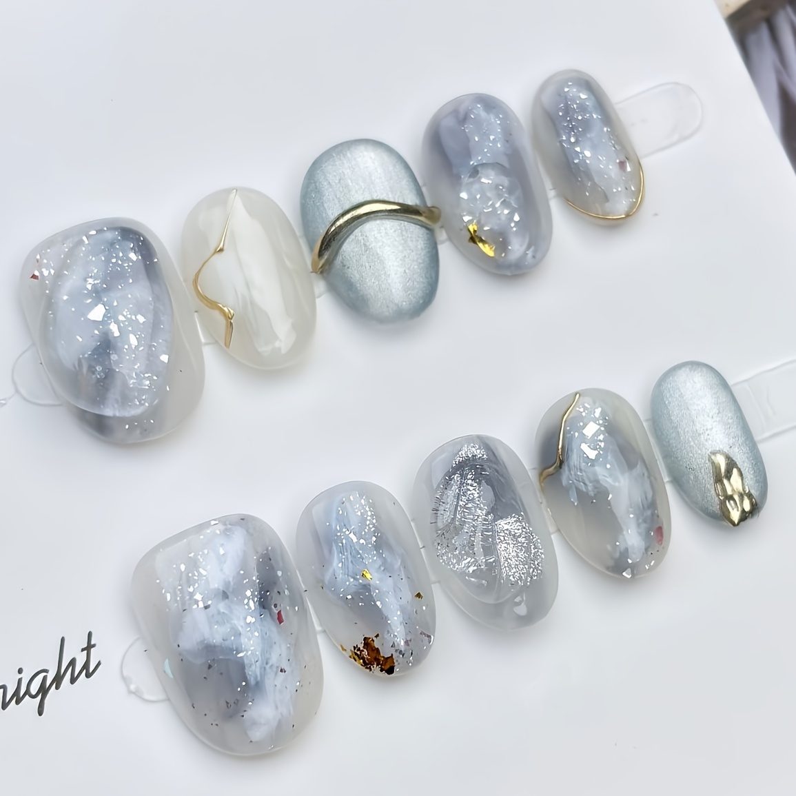 TEMU 10개 세트 핸드메이드 글로스 패치 매니큐어 - 회색-블루 대리석 무늬, 금속 장식이 있는 짧은 타원형 인조 손톱, 재사용 가능한 여성용 매니큐어 아트, 특별한 날을 위한 완벽한 선물, 세련된 디자인과 우아한 스타일의 패션 액세서리|네일아트