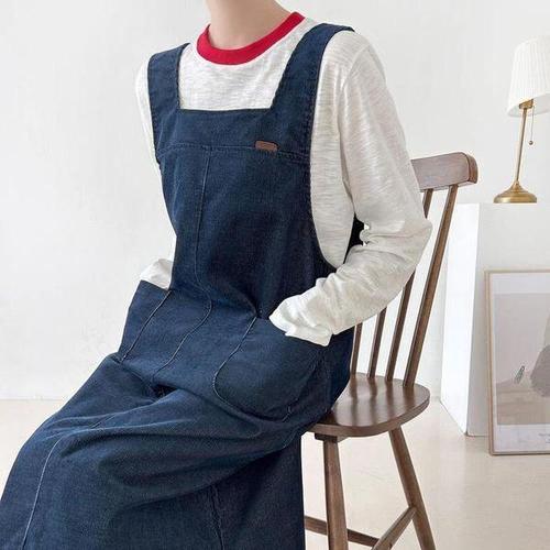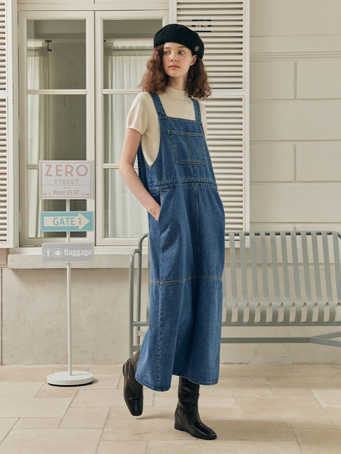 [옷자락] 여자 봄 스티치 오버롤 청멜빵 러블리 포켓 롱원피스