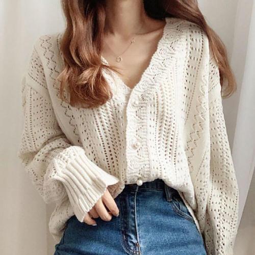 [기타브랜드]브이넥 루즈핏 진주단추 펀칭 긴팔니트가디건