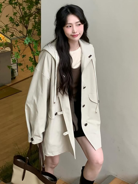 [어다울] 더플 라인 오버핏 후드 트랜치 코트 - 라이트 카키