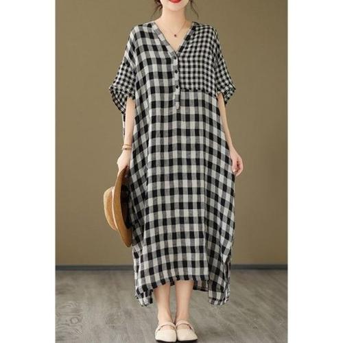 [엄지척]여성 여름 브이넥 체크 배색 루즈핏 롱 반팔 원피스_19912776_667501