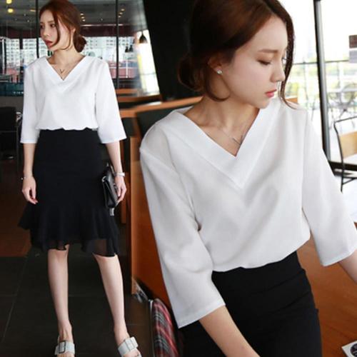 [에이치플러스몰]여성 카라 반팔 블라우스 오피스룩 쉬폰 셔츠 5부 4색
