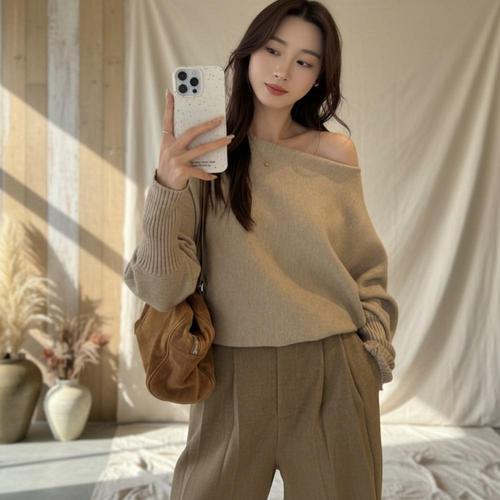 피어니스트 여성용 하이 엘레강스 루즈핏 오프숄더 니트