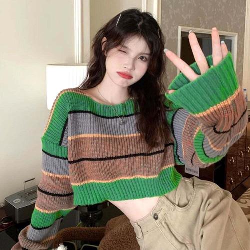 [옷자락] 여성 루즈핏 크롭 니트 오프숄더 긴팔 상의