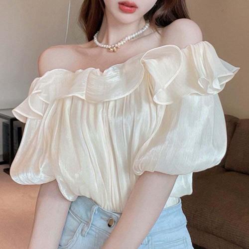[셀럽하우스]프릴 KHMT0590 밴딩 디자인 여성스러운 오프숄더 쉬폰 블라우스