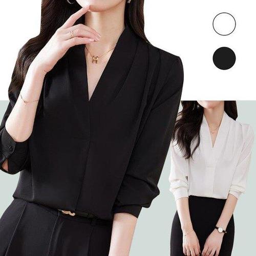 [로아리빙]여성스러운 긴팔 블랙 브이넥 블라우스 출근룩 하객룩