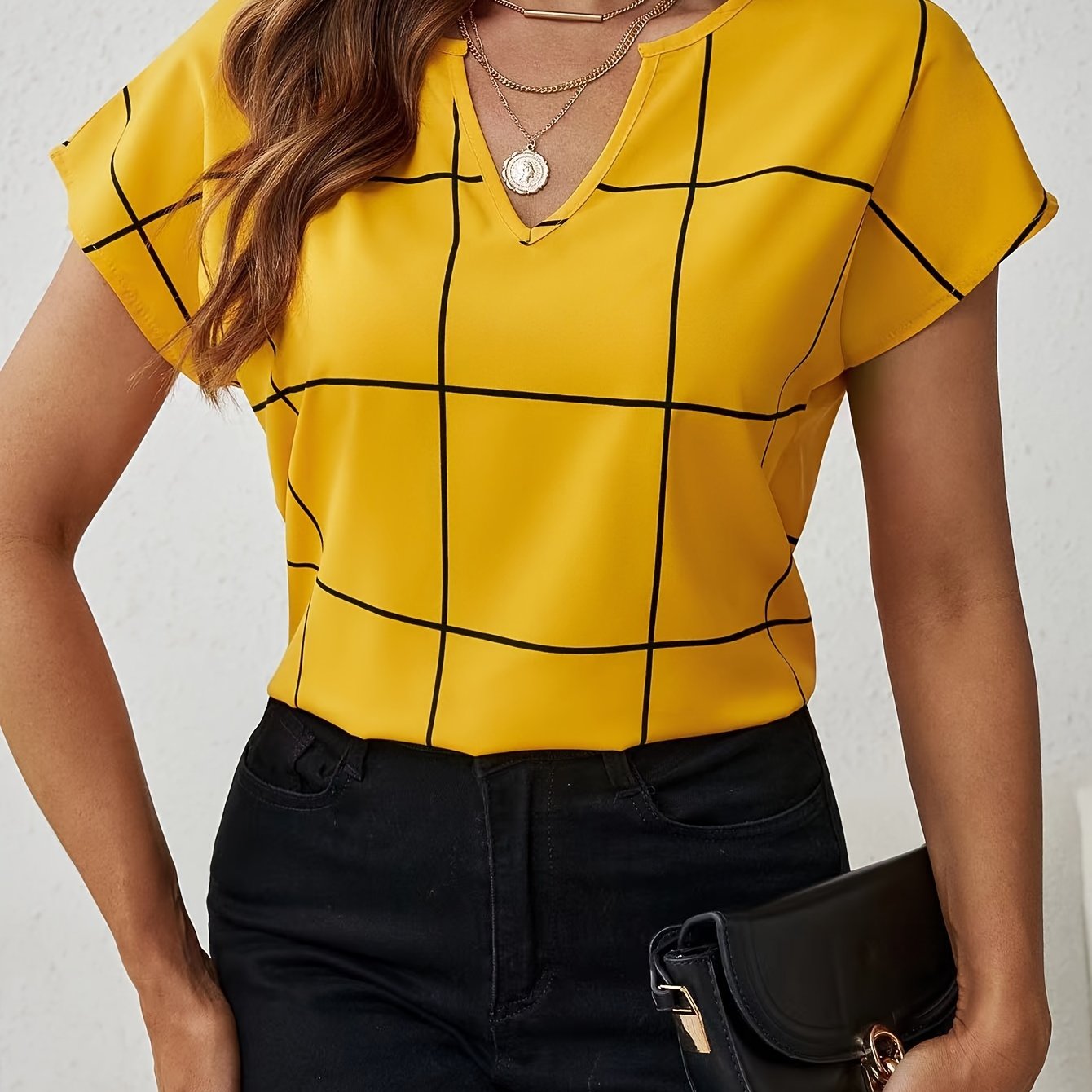 TEMU 여성용 우아한 V넥 반팔 블라우스 - 옐로우 & 블랙 아가일 패턴, H-실루엣 레귤러 핏, 봄 여름 가을 캐주얼 및 사무복 세탁 가능