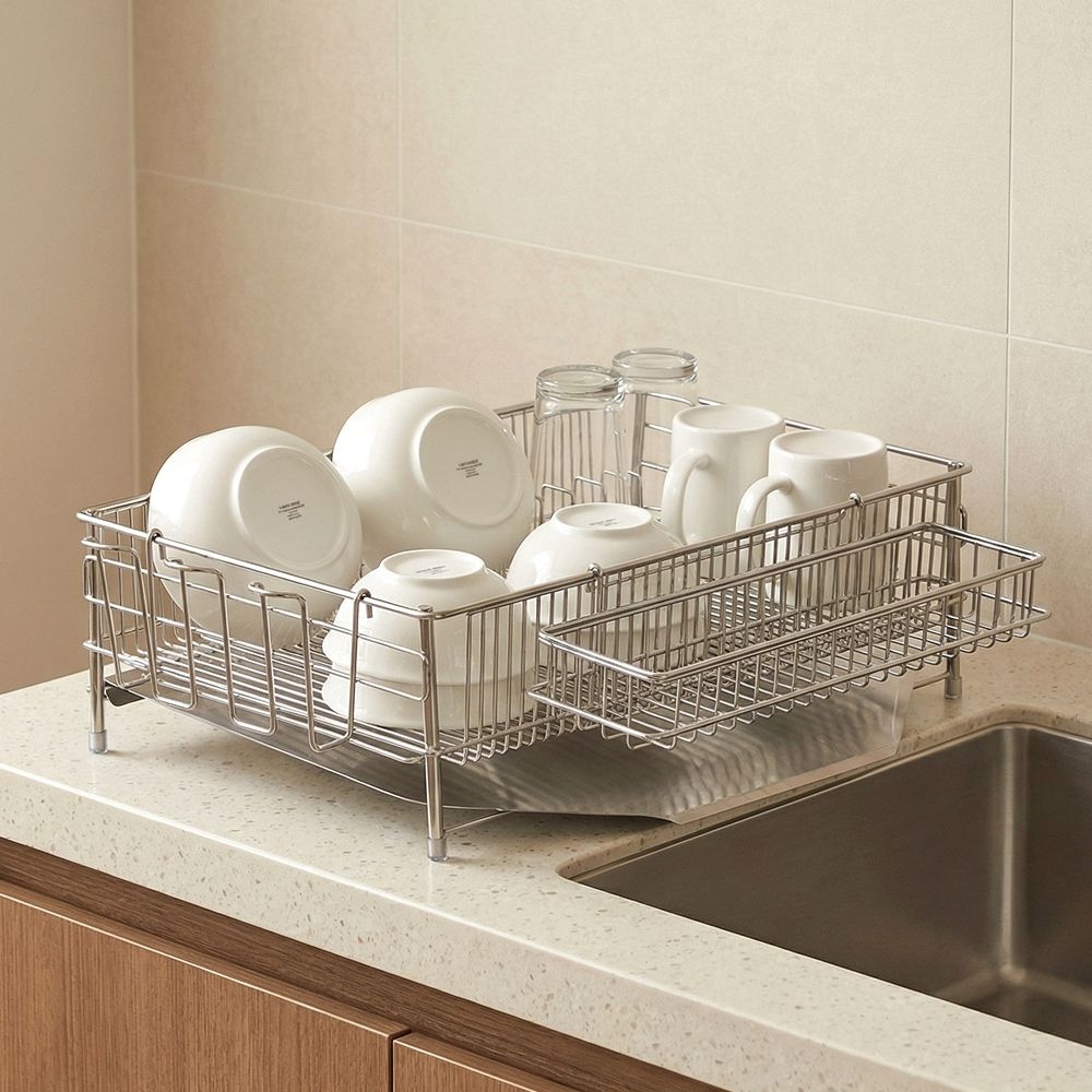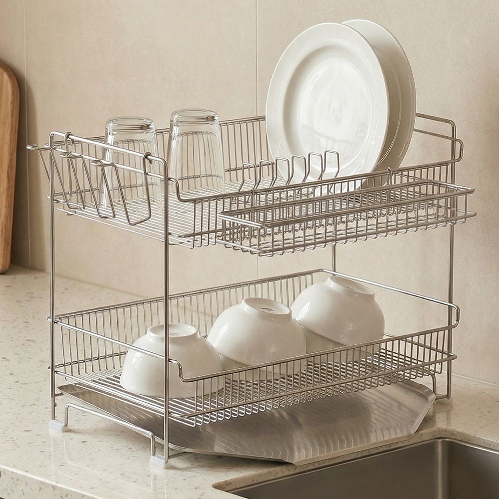 자동물빠짐 연마제 없는 올스텐304 2단 식기건조대+접시꽂이+컵꽂이+와이드바스켓