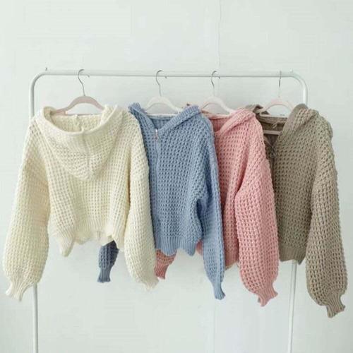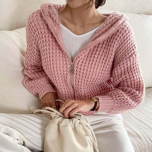 [의류] 여성 4컬러 와플 그물 크롭후드 니트 벌룬 집업점퍼