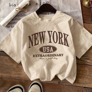 TEMU 여성용 캐주얼 스포티 반팔 티셔츠 - 뉴욕 USA 특별 그래픽 프린트, 연한 베이지, 통기성 라운드 넥, 세탁기 사용 가능 봄/여름 상의, 여성용 티셔츠, 트렌디 의류, 비침 방지 원단, 편안한 핏