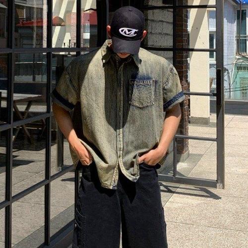 [피팅남]남자 벤키 오버핏 빈티지 워싱 반팔 청 데님 셔츠