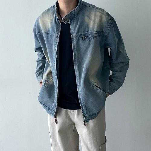 [모노폴로지]데님 바이커 청자켓 오버핏 차이나카라 라이더 레이싱 트러커 연청 옐로우워싱 데님자켓