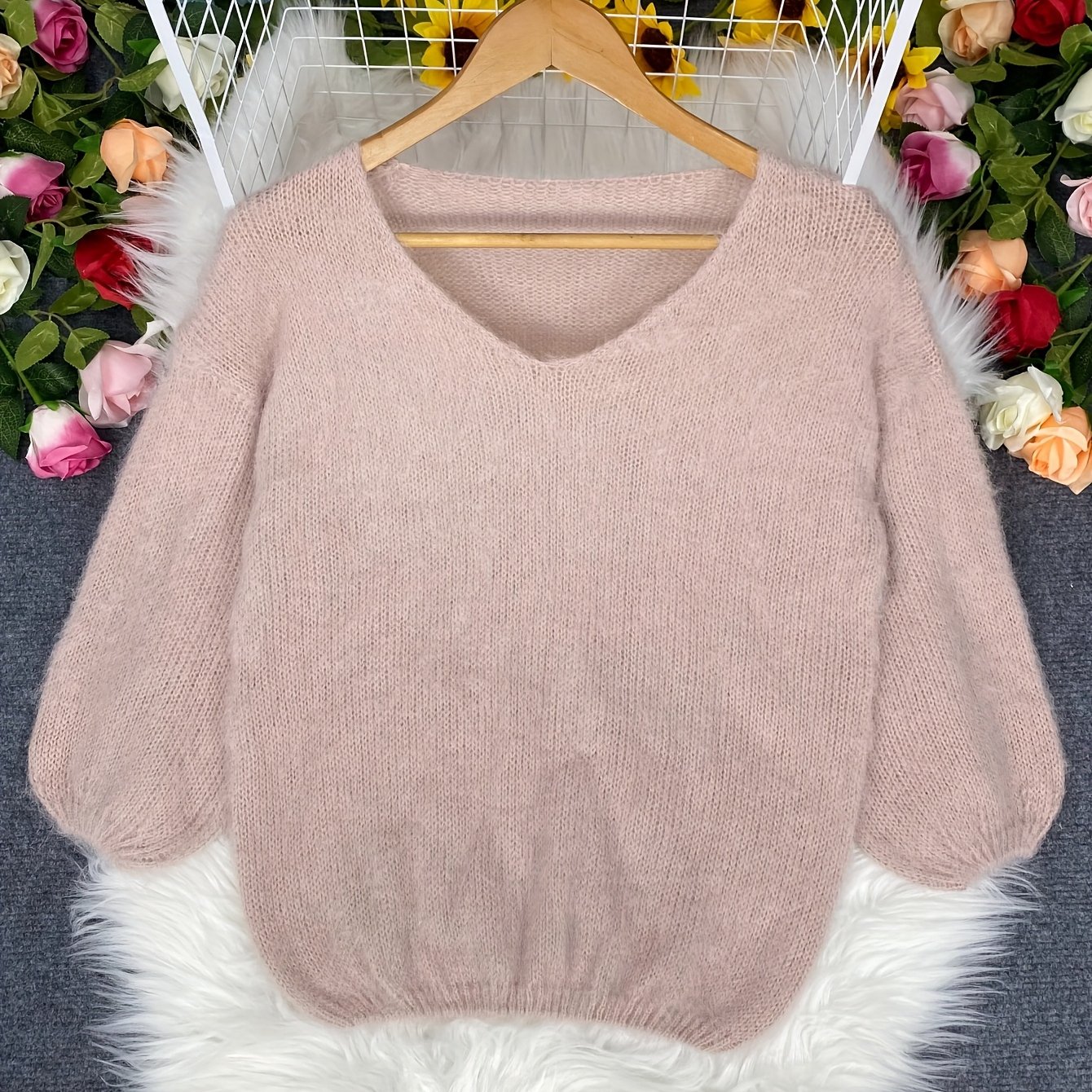 TEMU 새로운 패션 우아한 V넥 세븐쿼터 슬리브 솔리드 컬러 루즈핏 심플 데일리 커뮤트 데이트웨어 여성용 패브릭 풀오버