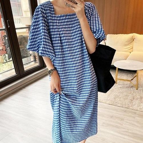 [엄지척]여성 여름 체크 반팔 루즈 오버 핏 롱 원피스 블루_19911986_667501