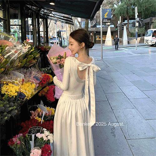 [르뚜앙]미체리 봄 가을 셀프웨딩 브라이덜샤워 하객룩 리본 백리스 롱원피스 드레스 플레어 화이트 스냅..