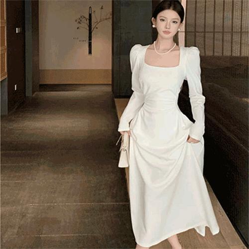 [르뚜앙]밈초코 셀프웨딩 브라이덜샤워 하객룩 피로연 퍼프소매 스퀘어넥 플레어 롱 원피스 봄 가을 화..