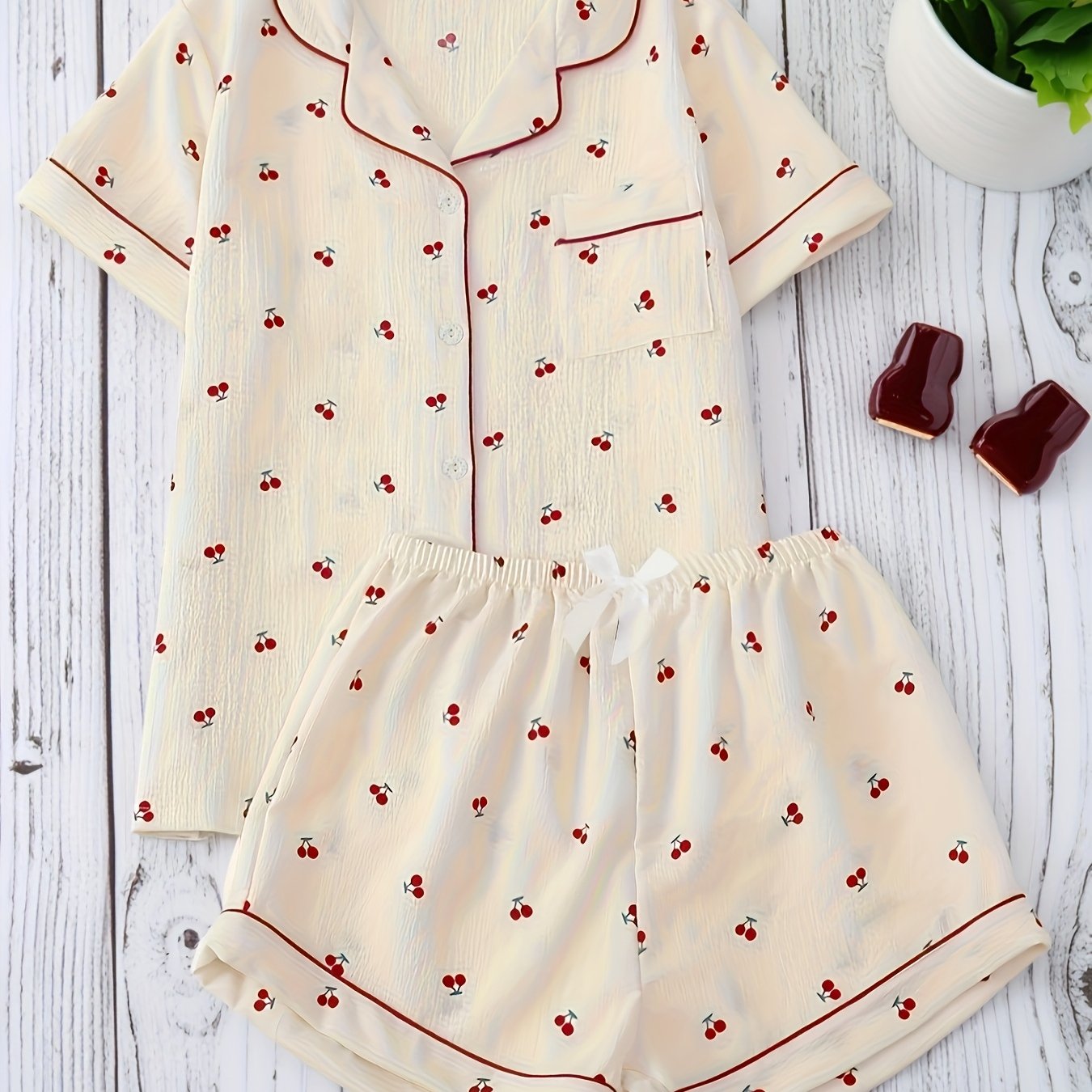 TEMU 체리 프린트 반팔 가디건 & 리본 반바지 잠옷 세트 | 캐주얼 라펠 칼라, 과일 & 채소 패턴, 모든 계절에 적합