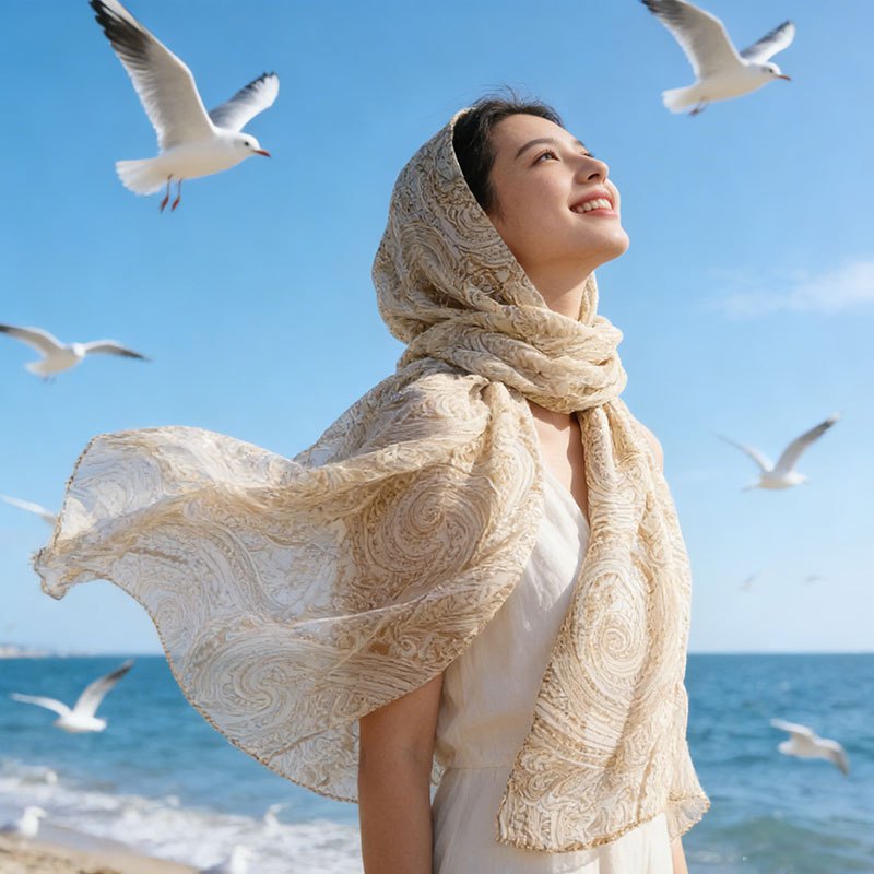 TEMU 100% 실크 숄 | 젠틀 베이지, 캐슈 패턴, 스타일, 가볍고 방풍, 봄/여름, 해변 나들이 및 축제 행사에 적합