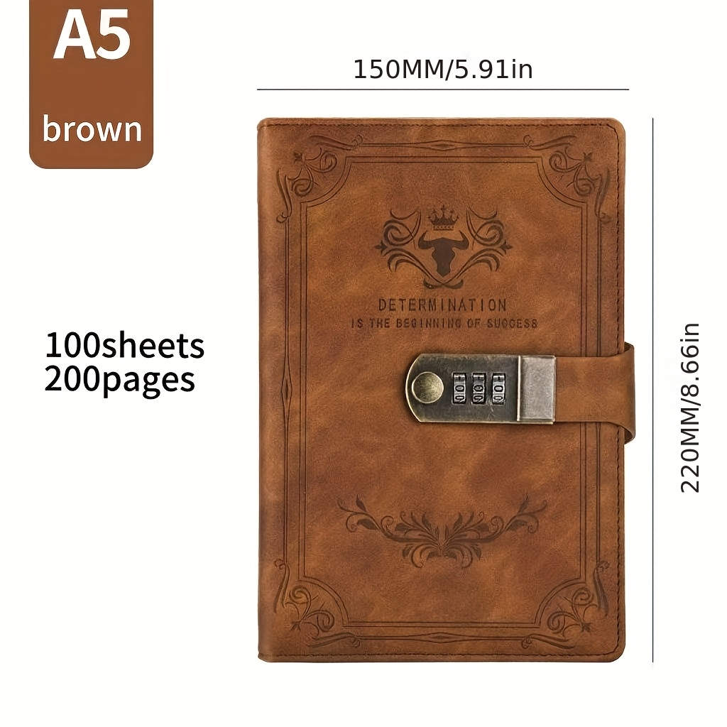TEMU A5 클래식 가죽 노트, 비밀번호 잠금, 200페이지 (100매) 저널 다이어리, 리필 가능 비즈니스 플래너 선물