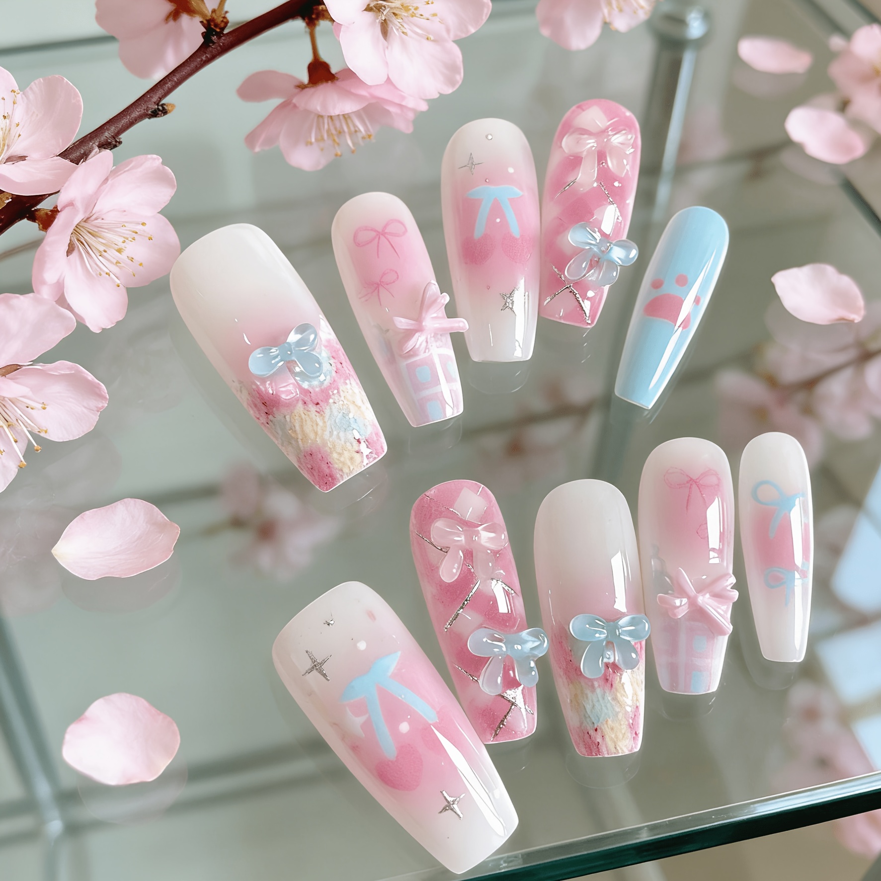 TEMU 플로럴 체리 수제 누ob 매니큐어 네일 10개 세트, 신선하고 귀여운 Y2K 감성, 사계절 스타일, 네일 아트 스티커, 일상 생활, 생일 파티, 모임, 댄스에 적합