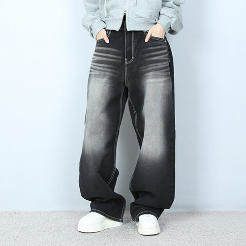 파라노말샵 / 데님 스티치 워싱 루즈핏 일자 와이드 팬츠 (파라노말