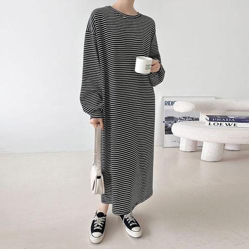 [유야]데일리 단가라 박시 긴팔 롱 원피스 임부복 -OP0567H- 빅사이즈 루즈핏 여성 가을
