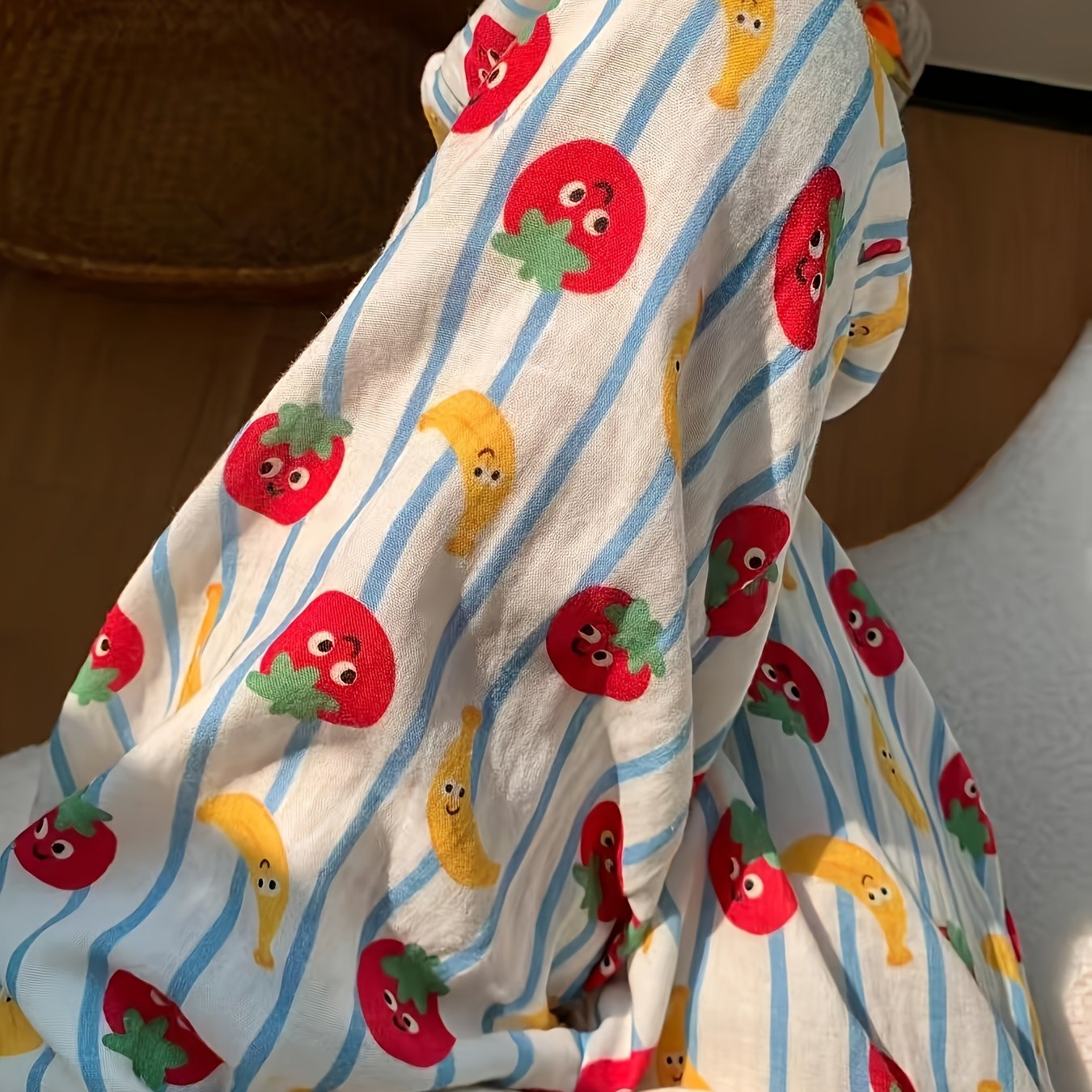 TEMU 여성용 탄성 허리 밴드 와이드 레그 팬츠 - 토마토 및 바나나 프린트, 가벼운 폴리에스테르, 편안한 모든 계절의 디자인, 컬러풀한 만화 디자인, 귀여운 팬츠