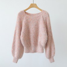 제니트 여성 몽글몽글 컬러 믹스 퍼프 소매 세미크롭 시보리 보트넥 긴팔 니트
