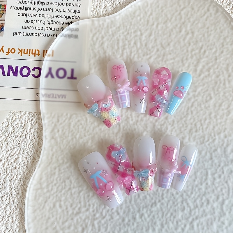 TEMU 10개입 핸드페인팅 체리 & 보우 글로시 프레스온네일 - 3D 층별디자인 발레형 롱 가성비, 핑크 벚꽃과 하트&보우, 재사용 간편적용 (특별한 날/파티/캐주얼), 세부 있는 매니큐어, 내구성 UP|네일아트|네일팁
